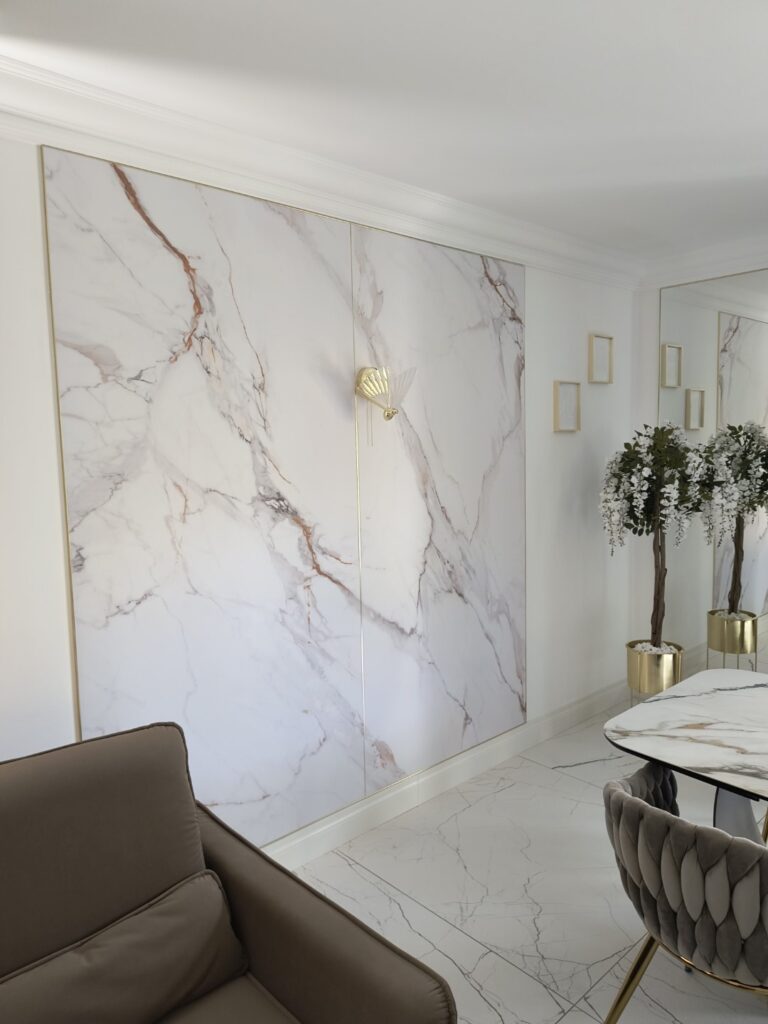 Rezultatem jest jednolita, elegancka płaszczyzna ścienna o wyraźnie mineralnym wyrazie, która łączy estetykę naturalnych surowców z precyzją nowoczesnej technologii kompozytowej. Płyty z kolekcji PREMIUM podkreślają prestiż wnętrza, budując wrażenie monolitu i dopracowanego detalu – szczególnie cenione w przestrzeniach reprezentacyjnych, strefach ekspozycyjnych oraz aranżacjach klasy high-end.