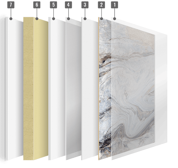 - Warstwa krystaliczna nośna – Sztywna warstwa wzmacniająca, zwiększająca odporność płyty na nacisk punktowy i obciążenia mechaniczne. Odpowiada za zachowanie geometrii panelu przy dużych formatach.